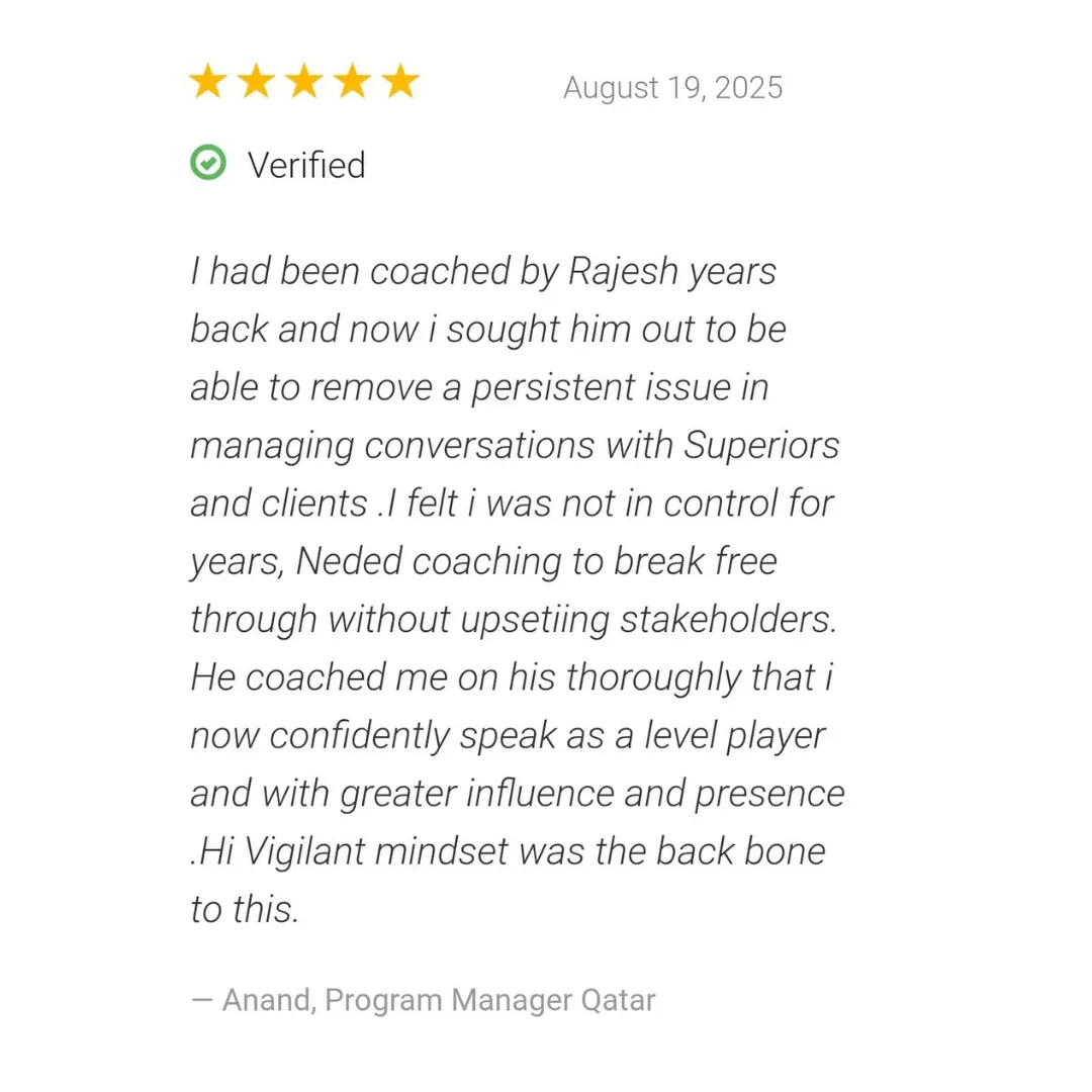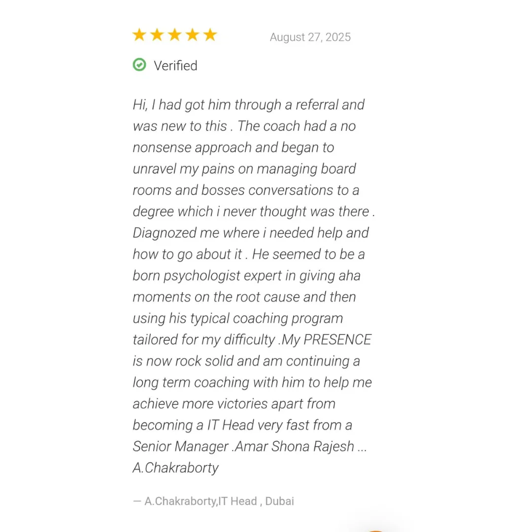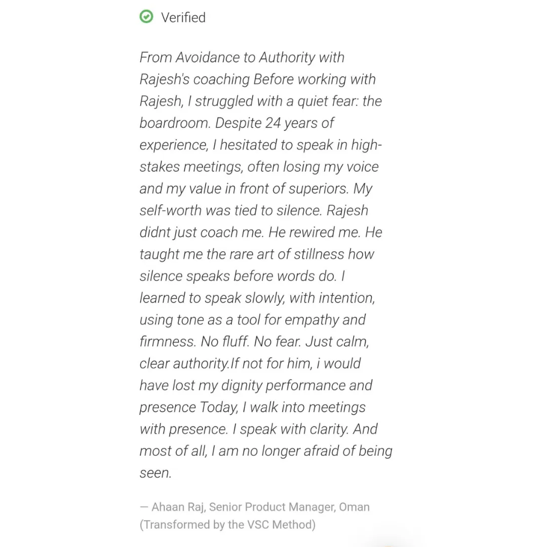 I’m an IIT graduate, ex-VP in global firms like Accenture and HCL, and I’ve personally turned from a hesitant engineer into a bold leader who saved companies, marriages, and careers. I’ve coached 40+ professionals to master conflicts, tough conversations, and leadership presence — with a 95% success rate.